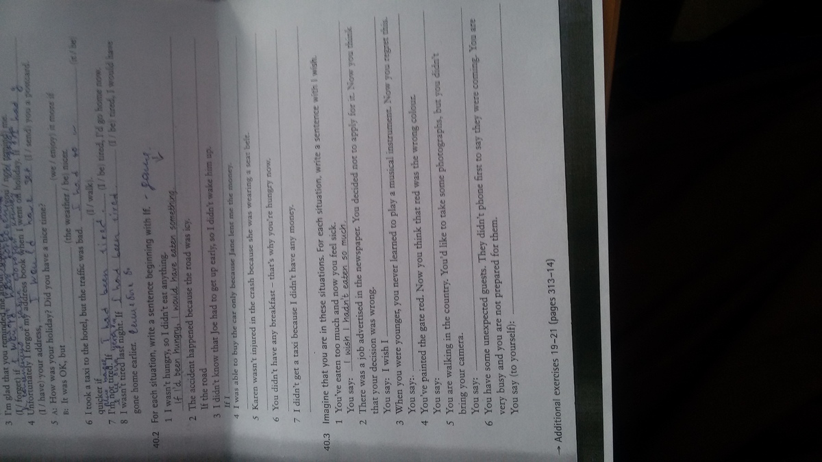 Вы говорите: Жаль, что я не ел так много. Теперь вы спасибо 2 Был работу рекламируется в газете. Вы решили не применять к нему. что ваше решение было неправильным. Вы говорите: я хочу, чтобы я музыкальный инструмент. Теперь вы об этом пожалеете 3 Когда вы были моложе, вы никогда не научились играть Iou говорят: вы думаете, что красный был неправильный цвет 4 Wou е окрашены ворота красного цвета. Теперь говорят: сделать несколько фотографий, но не 5 Go идут в стране. Вы хотели бы, чтобы ваша камера г. НУ сказать: сказать, что они придут Ты есть несколько неожиданных гостей. Они не телефон сначала очень занят, и вы не готовы к ним. Вы говорите (про себя): Дополнительные упражнения 19-21