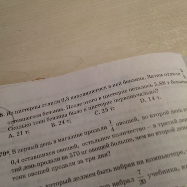 Задача: Из цистерны отлили 0,3 находящегося в ней бензина.Затем отлили 3числитель/5знаменатель оставшегося бензина. После этого в цистерне осталось 5,88 т бензина. Сколько тонн бензина было в цистерне первоначально?