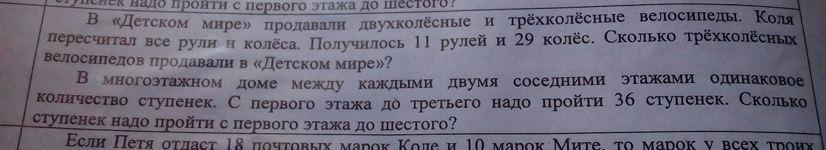 29 колес - (11 рулей * 2 колеса) = 29-22 = 7 колес "лишних", т.е. 7 трехколесных велосипедов