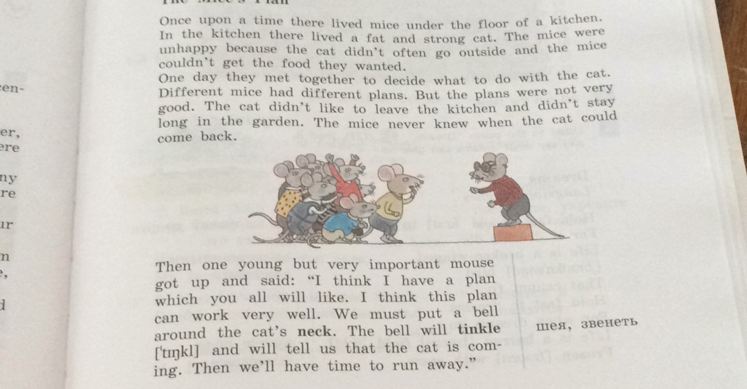 Тогда одна молодая, но очень важная мышь встала и сказала: Я думаю, что у меня есть план, который вам всем понравится. Я думаю, что этот план сработает очень хорошо. Мы должны поместить звонок на шею кошки. Звонок будет звякать и оповестит нас о том, что идет кошка. Тогда у нас будет время, чтобы убежать.