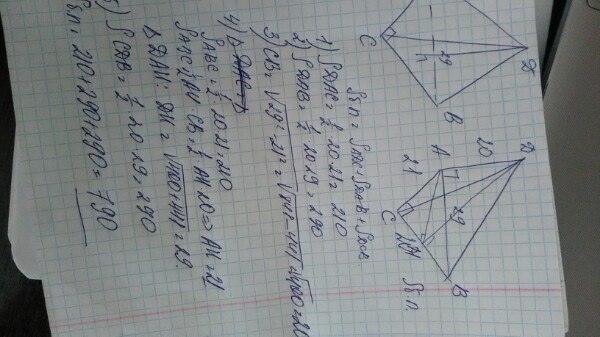 Основанием пирамиды DABC является прямоугольный треугольник ABC, у которого гипотенуза AB равна 29 см, катет AC равен 21 см. Ребро DA перпендикулярно к плоскости основания и равно 20 см. Найдите площадь боковой поверхности пирамиды.