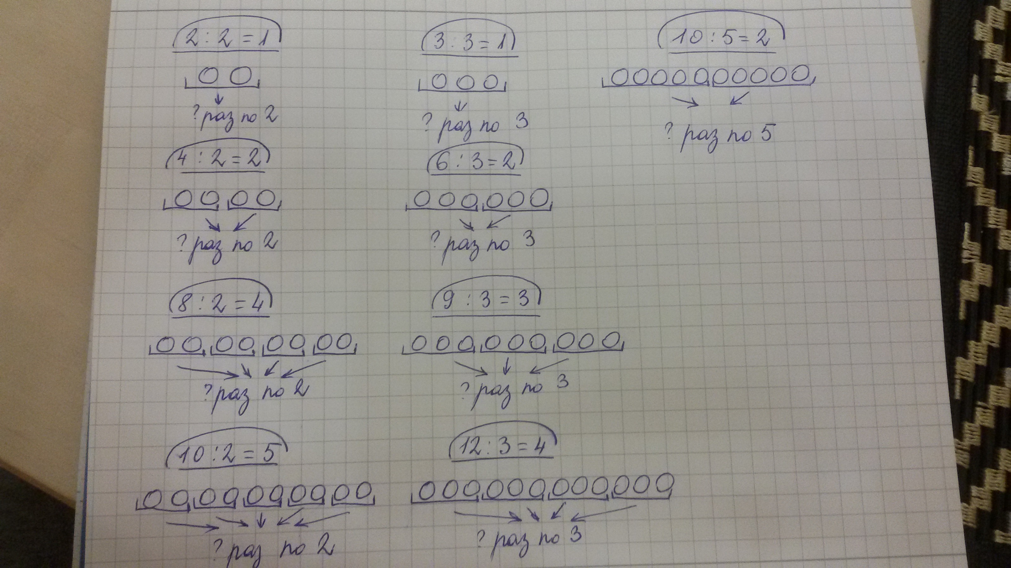 сделайте схематический рисунок и вычисли: 1) 2 деленное на 2, 4 деленное на 2, 8 деленное на 2, 10 деленное на 2; 2) 3 деленное на 3, 6 деленное на 3, 9 деленное на 3, 12 деленное на 3, 10 деленное на 5.