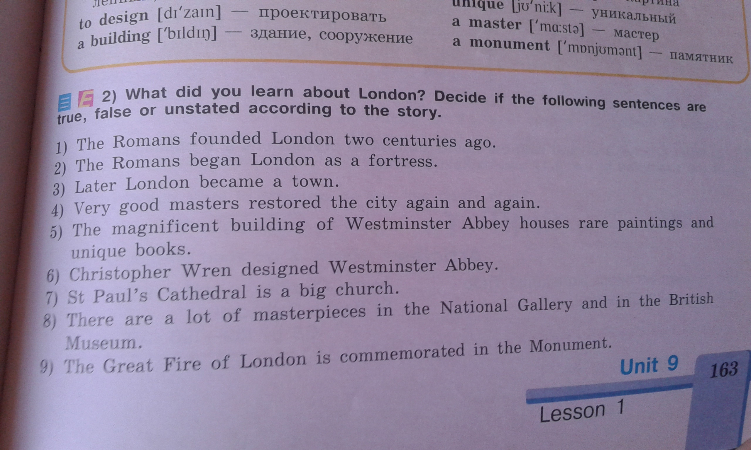 1) римляне основали в Лондоне два столетия назад 2) римляне начали Лондон в качестве крепости. 3) В дальнейшем Лондон стал городом. 4) очень хорошие мастера снова и снова восстановили город. 5) Великолепный здание Вестминстерского аббатства дома редкие картины и 6) уникальные книги. Аббатство. Кристофер Рен Вестминстерский собор разработан 70 St Paul 's большая церковь. Британский 8) Есть много шедевры в Национальной галерее и в музее. отмечается в памятнике. 9) Большой пожар в Лондоне
