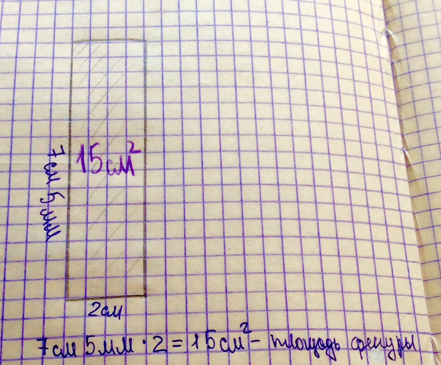 Прямоугольник, имеющий площадь 15см², а также длину 7см 2мм(7,5см) и ширину 2см.