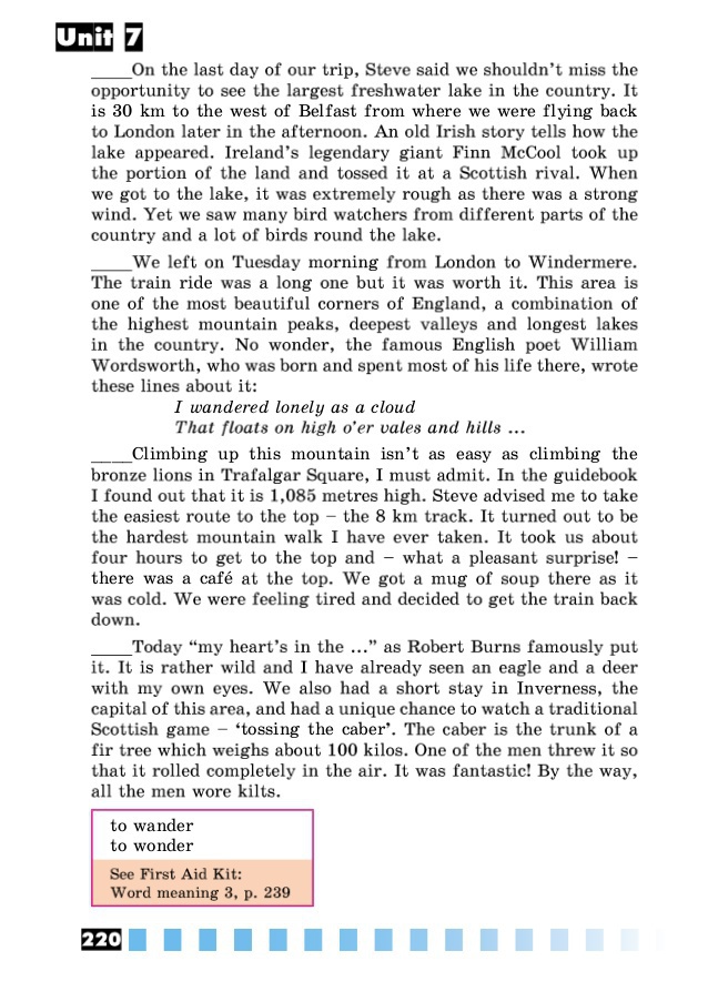 В последний день поездки, Стив сказал, что мы не должны терять возможность увидеть самое большое пресноводное озеро в стране. Оно в 30 км к западу от Белфаста, из которого мы летели назад в Лондон позже днем. Старая ирландская история рассказывает о том, как появилось озеро. Ирландский легендарный гигант Финн МакКул поднял часть земли и бросил ее на шотландских врагов. Когда мы добрались до озера, оно было очень неровное, так как был сильный ветер. Еще мы видели множество птиц, наблюдателей из всех частей страны и много птиц вокруг озера. Во вторник утром мы уехали из Лондона в Виндермер. Дорога в поезде была длинной, но это того стоило. Эта местность - одна из наиболее красивых уголков Англии, сочетание высочайших горных пиков, глубочайших долин и самых длинных озер в стране. Не удивительно, что известный английский писатель Уильям Вордсворт, который родился и провел большую часть жизни здесь, написал эти строчки об этом: