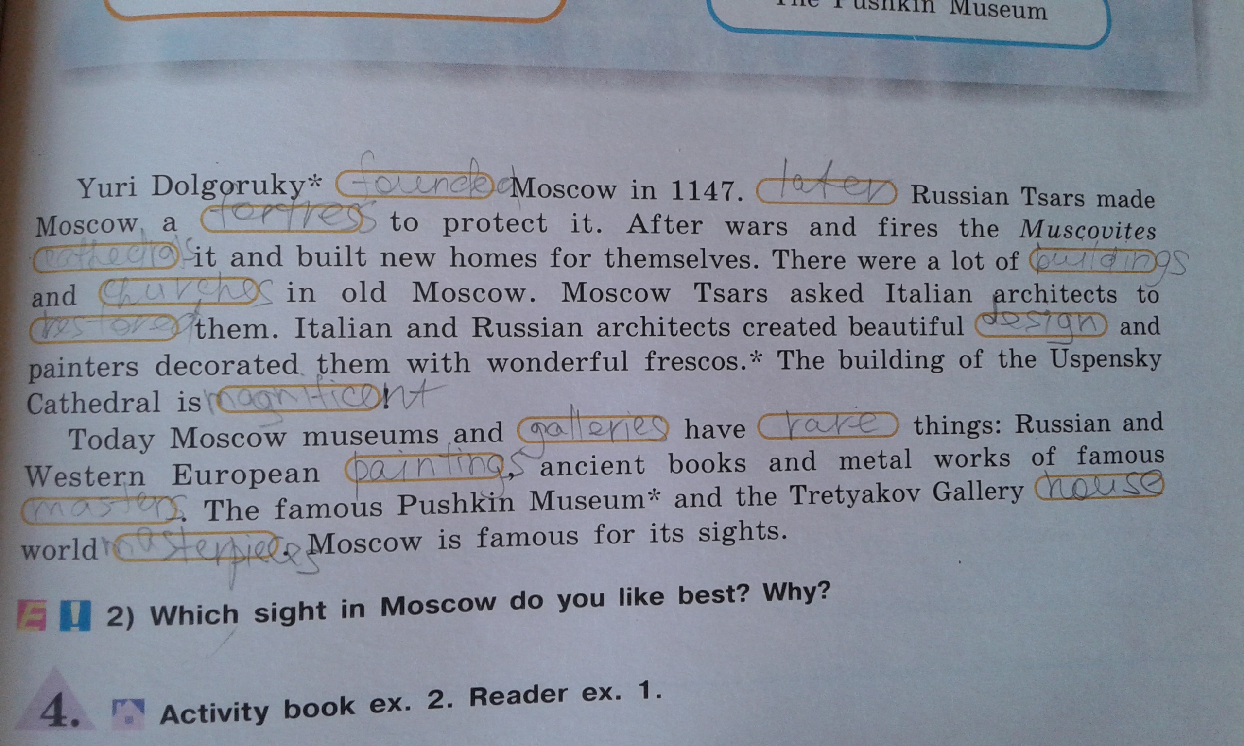Юрий Долгорукий * и Москва в 1147 году русским царям, чтобы защитить ее. После войн и пожаров Москвичи г. Москва, это и построены новые дома для себя. Были много в старой Москве. Москва Цари спросил итальянский архитектор и им. Итальянские и российские архитекторы создали красивый и художники украшали их прекрасными фресками. Здание Успенского собора Вкл Сегодня московские музеи и ATen20 есть вещи: русские и древние книги и металлические произведения известных Западноевропейские Пушкина и Третьяковская галерея Знаменитый музей Москва славится своими Достопримечательности. мир 2), Прицел в Москве вам больше всего нравится? Зачем? л 4. Деятельность Книга ех. 2. Читатель экс. 1.