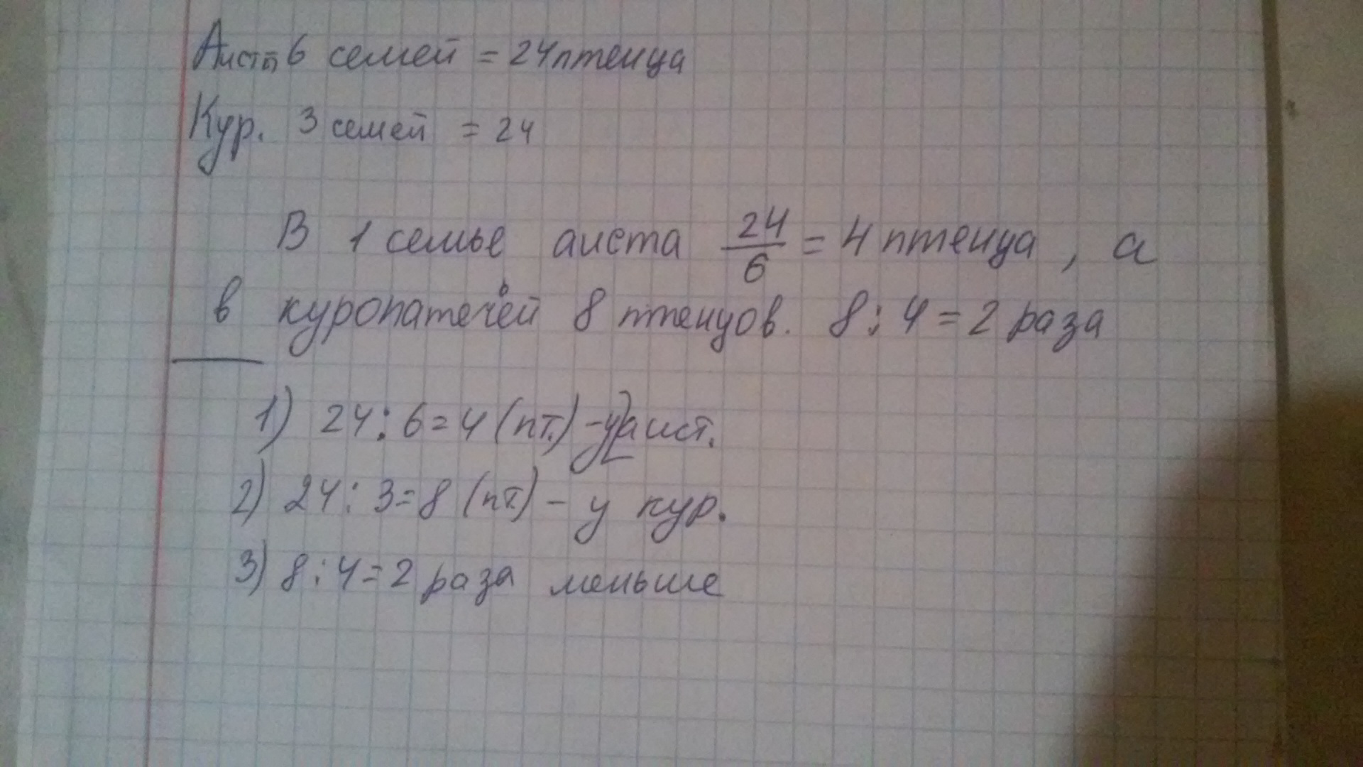 У шести семей аистов поровну птенцов,а всего 24 птенца.У трех семей серых куропаток поровну птенцов,а всего 24 птенца. Во сколько раз в одной семье аистов меньше птенцов,чем в одной семье серых куропаток?