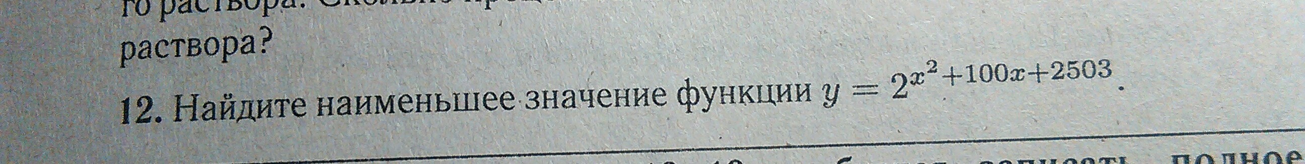y=2^{x^2+100x+2503}\\y'=2^{x^2+100x+2503}cdot ln2cdot (2x+100)=0\\Tak; kak; ln2 textgreater  0; ,; 2^{x^2+100x+2503} textgreater  0; ,; ; to; ; 2x+100=0,\\x=-50\\Znaki; y'; :; ; ---(-50)+++\\.quad quad quad qquad quad searrow ; (-50); nearrow \\x_{min}=-50\\y_{min}=2^{2500+5000-2503}=2^{4997}