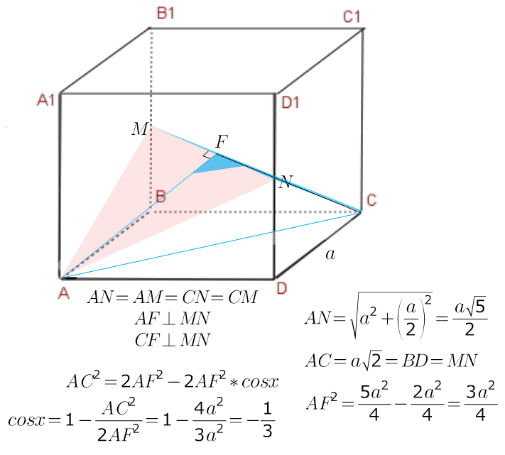Дан куб ABCDA1B1C1D1. Точки M и N- середины рёбер BB1 и DD1 соответственно. Найдите угол между плоскостями AMN и CMN