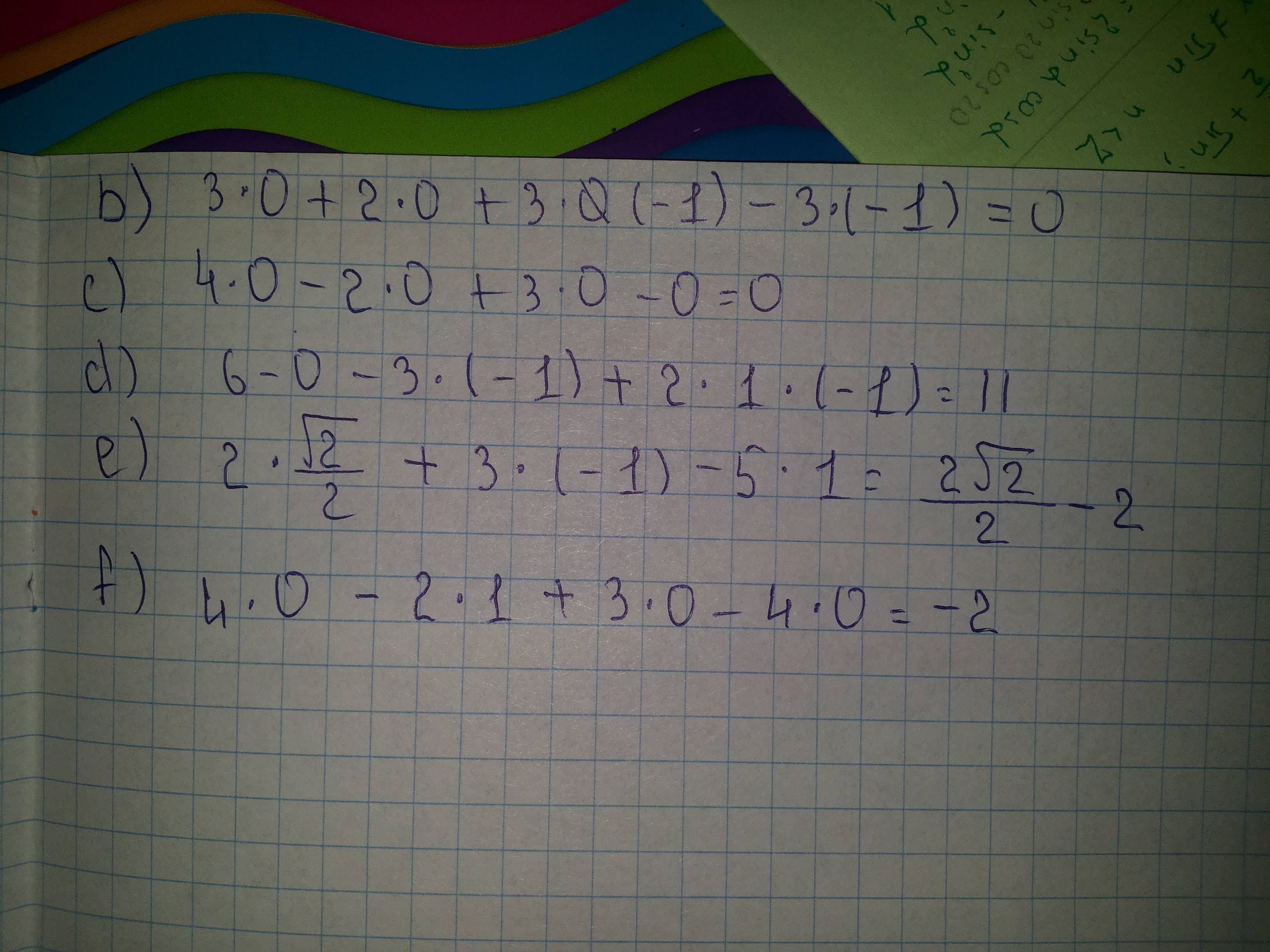 b. 3*0+2*0+3*(-1)-3*(-1)=0<br />c.4*0-2*0+3*0-0=0<br />d.6-0-3*(-1)+2*1*(-1)=11<br />e. 2*два под корнем деленое на два+3*(-1)-5*1=корень из двух минус два <br />f. 4*0-2*1+3*0-4*0=-2