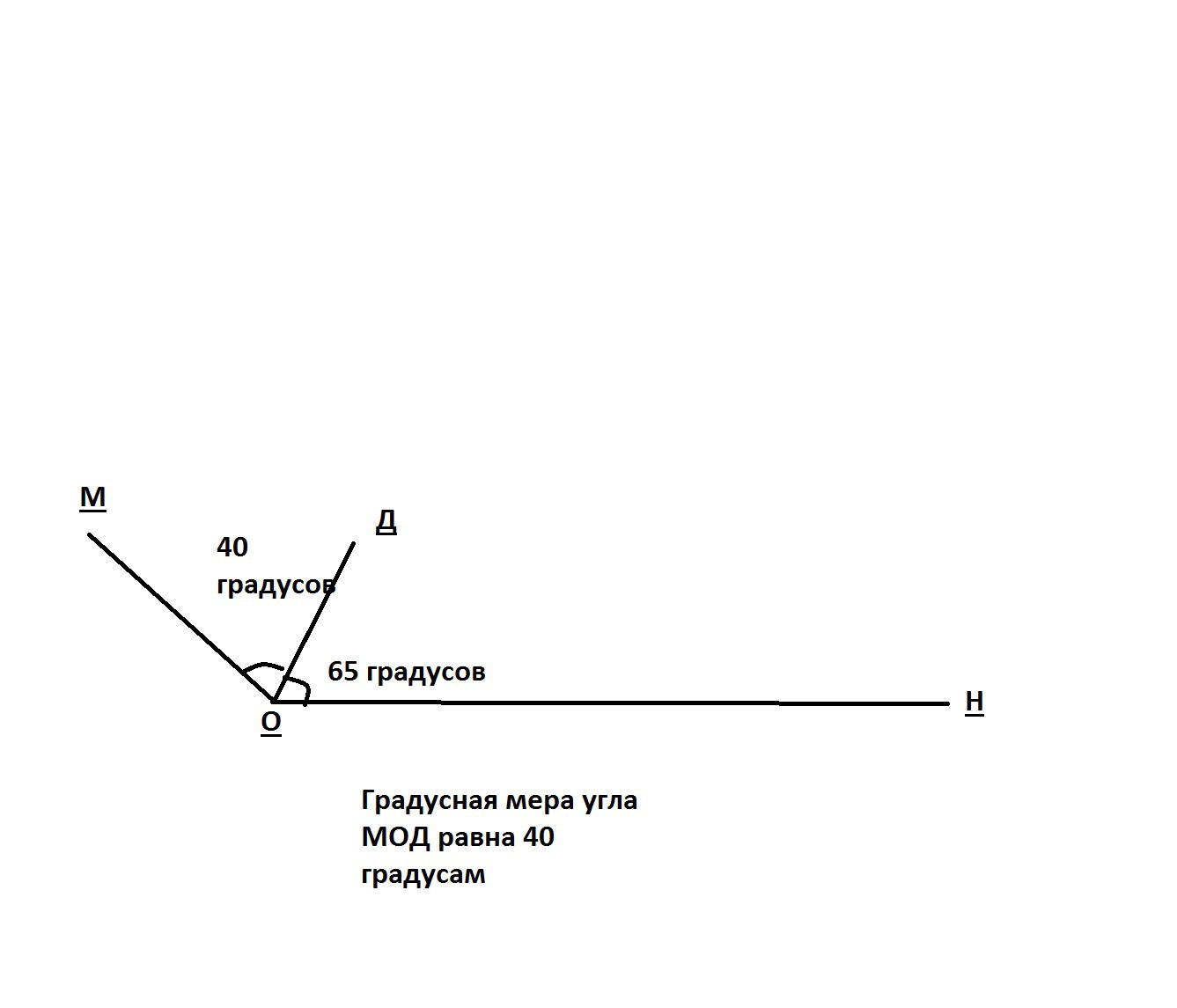 начертите угол MON,равный 140°. Лучом OD разделите этот угол так, чтобы угол DON был равен 65°. Вычитлите градусную меру угла MOD( помогите)