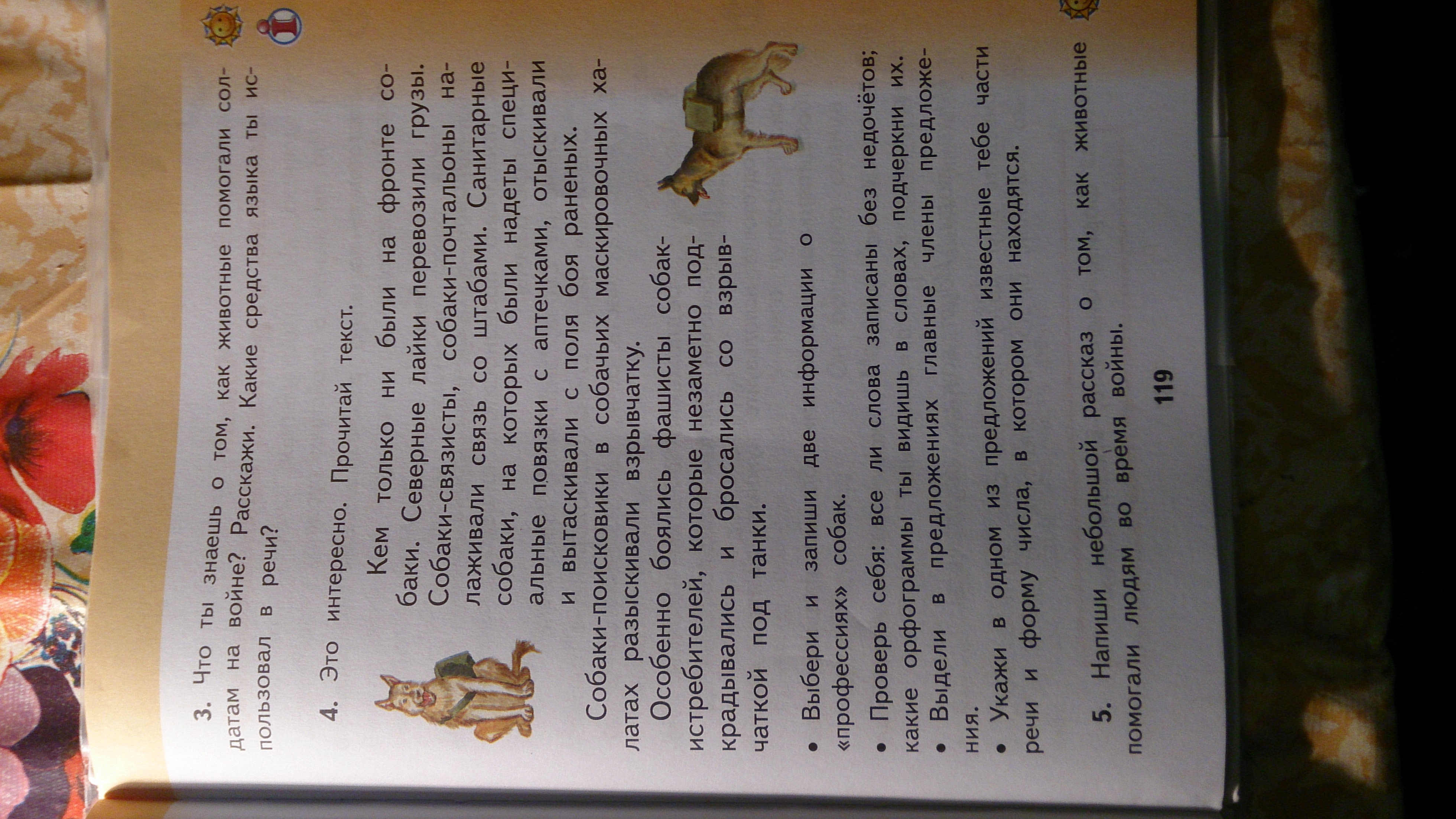 Кем только ни были (сказуемое, =) на фронте собаки (подлежащее, __). Северные лайки (подлежащее, ___) перевозили (сказуемое) грузы. Собаки-связисты (однородное подлежащее, ___), собаки-почтальоны (однородное подлежащее, ___) налаживали (сказуемое, =) связь со штабами. Санитарные собаки (подлежащее, ___), на которых были надеты специальные повязки с аптечками, отыскивали (однородное сказуемое, =) и вытаскивали (однородное сказуемое,=) с поля боя раненых.