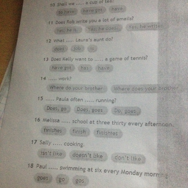 Have; Yes,he does; does; have; Where does your brother; does,go; finishes; doesn't like; goes.