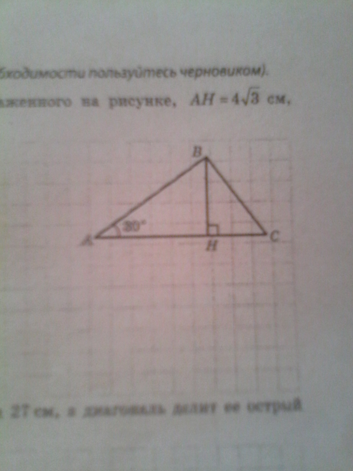отрезок ВН - высота треугольника АВС,изображённого на рисунке, АН=4√3см,НС=2√5см. какова длина стороны ВС?
