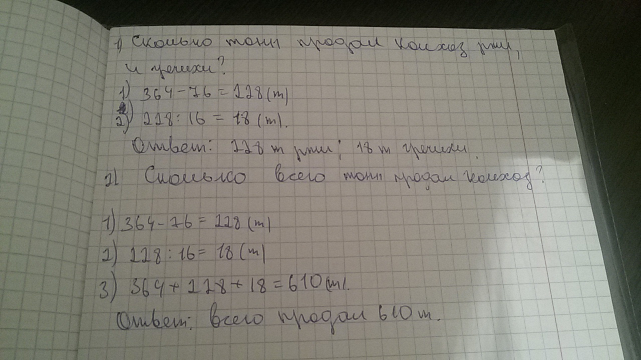 Колхоз продал 364 т пшеницы , ржи на 76 т меньше , чем пшеницы, а гречихи в 16 раз меньше, чемржи. Поставь вопросы так,чтобы задача решалась в два действия; в три действия