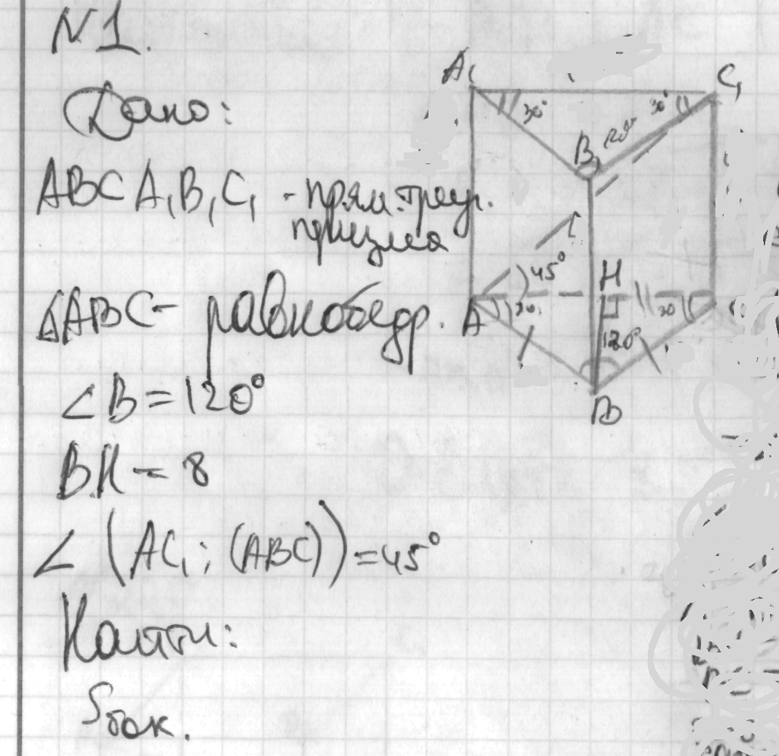В основании у нашей призмы - треугольник, равнобедренный, с углом при вершине 120 градусов, высота, проведенная к основанию, равна 8, тогда боковая сторона вдвое больше высоты, т.е. 16. А основание этого треугольника равно, соответственно, квадратному корню из трех.