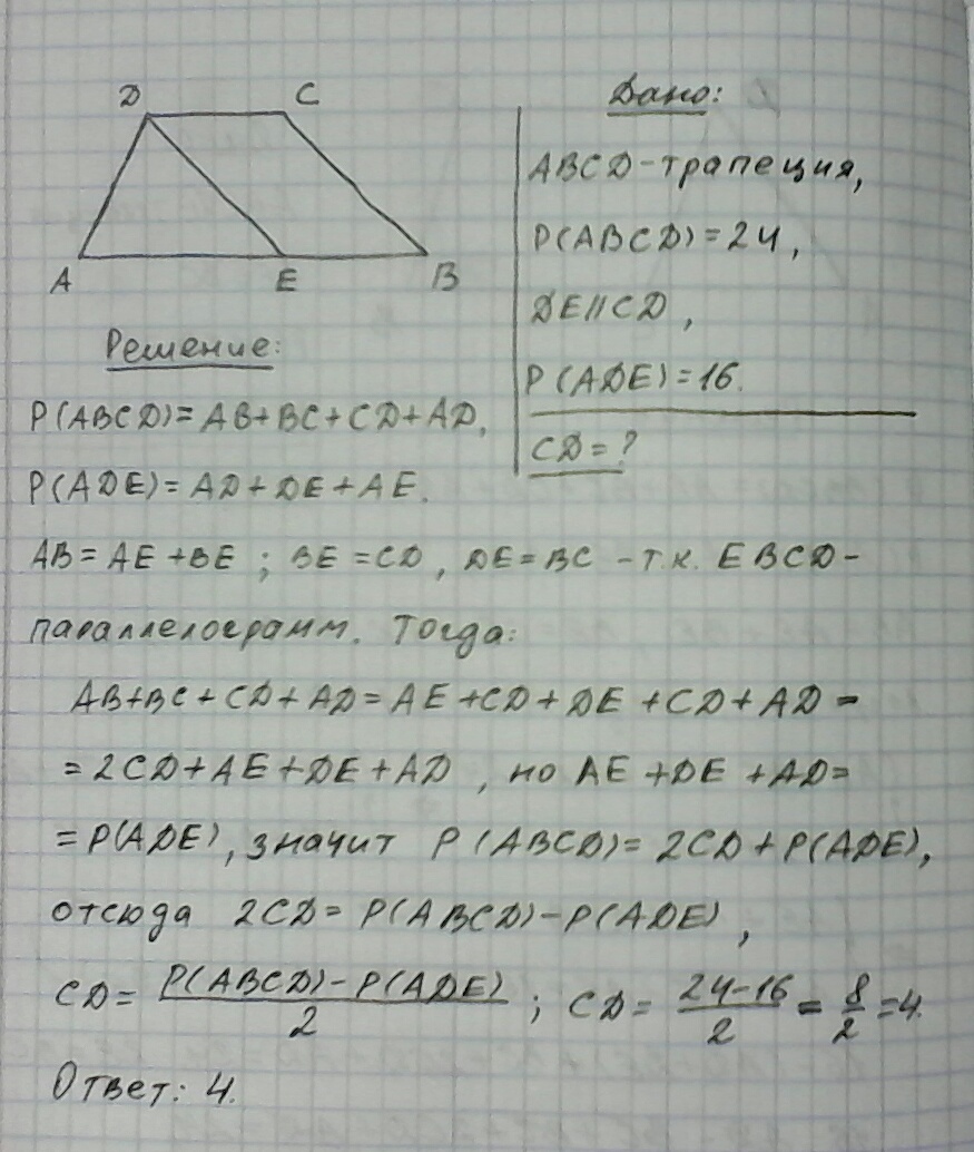 пириметр трапеции ABCD равен 24 прямая проведенная паралельно боковой стороне BC через вершину D отсекает триугольник ADE периметр которого равен 16 найдите основание CD трапеции