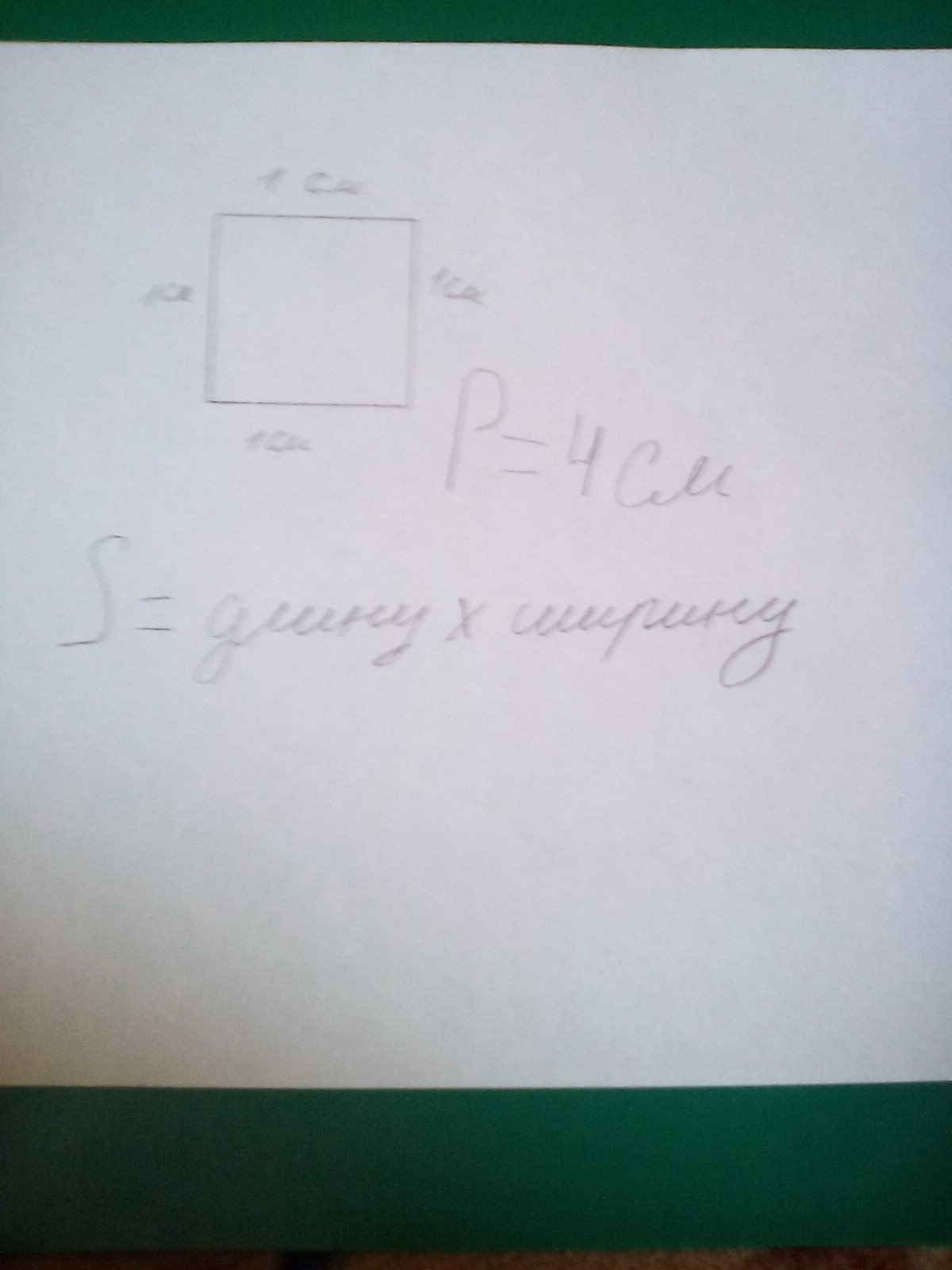 У меня линия длиной 4см. Значит 4 см это периметр всего квадрата. Так как периметр это сумма длин всех сторон а у квадрата их 4 .Нужно 4:4=1(см) . Получается что каждая сторона квадрата будет равна одному см.