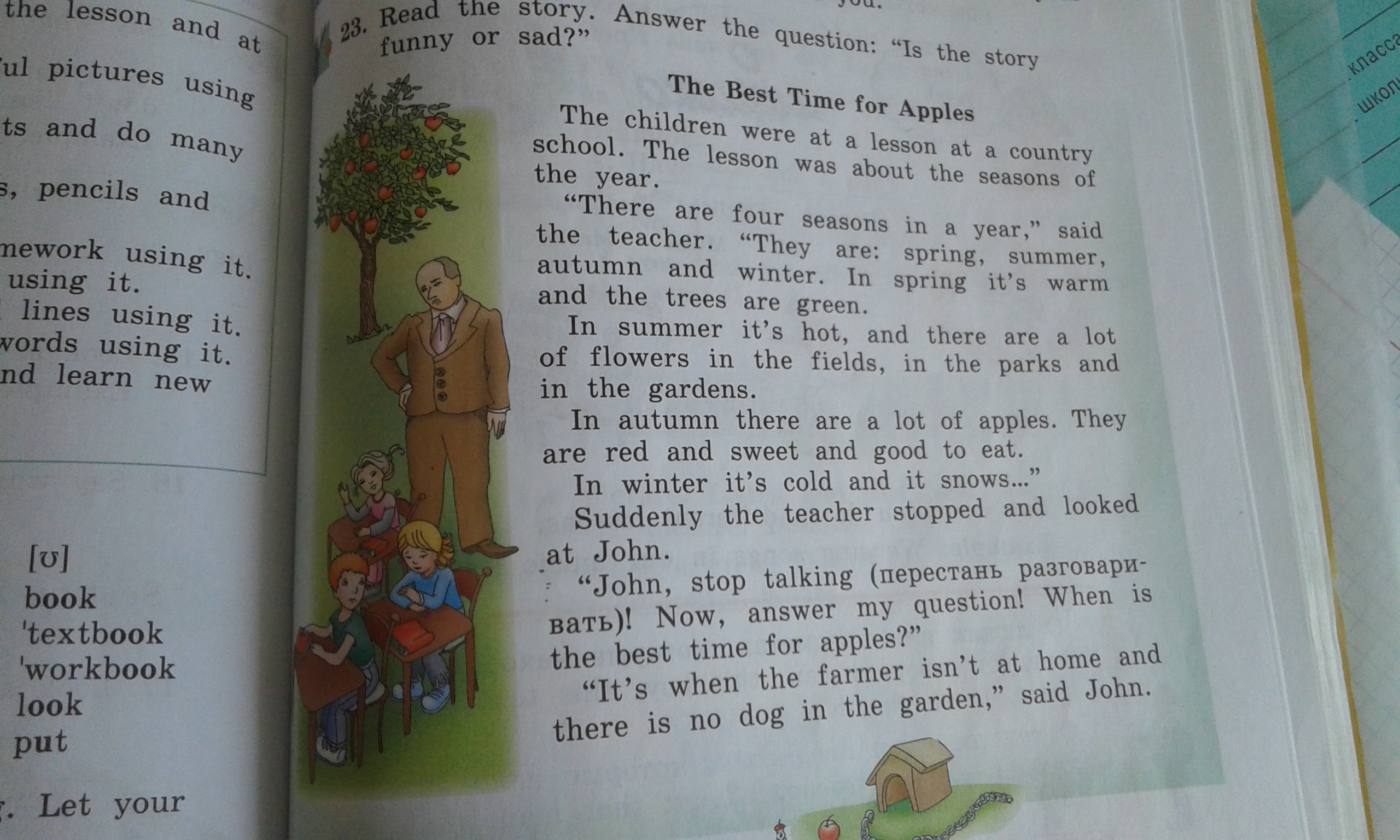 Дети были на уроке в сельской школе.Урок был о сезонах года."В году 4 сезона ". Это весна, лето,осень,зима.Весной тепло и деревья зеленые.Летом жарко и много цветов в полях,парках и садах.Осенью много яблок.Они красные и сладкие и их (приятно,хорошо) кушать.Зимой холодно и идет снег.Вдруг учитель остановился и посмотрел на Джона.Перестань разговаривать!Сейчас же ответь на мой вопрос !Лучшее время для яблок?Оно когда фермеры не дома и в садах нет собак- сказал Джон.