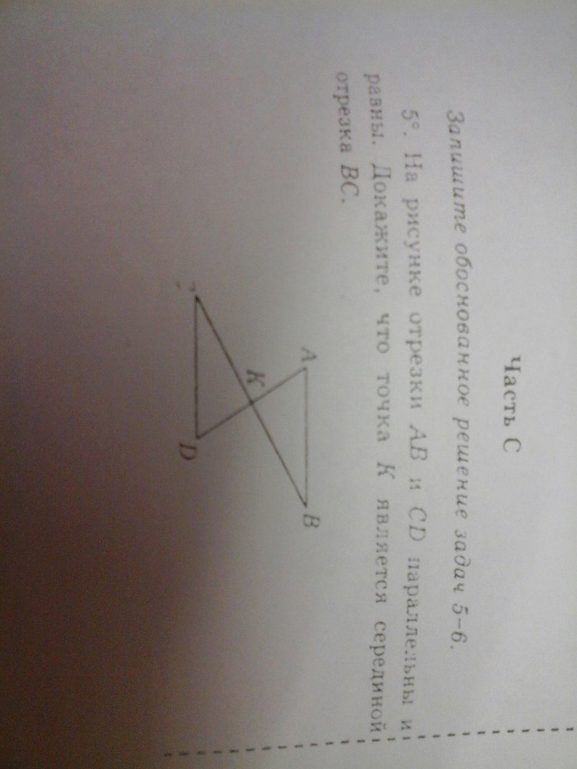 НА РИСУНКЕ ОТРЕЗКИ AB И CD ПАРАЛЛЕЛЬНЫ И РАНЫ.ДОКАЖИТЕ,ЧТО ТОЧКА K ЯВЛЯЕТСЯ СЕРЕДИНОЙ ОТРЕЗКА BC.