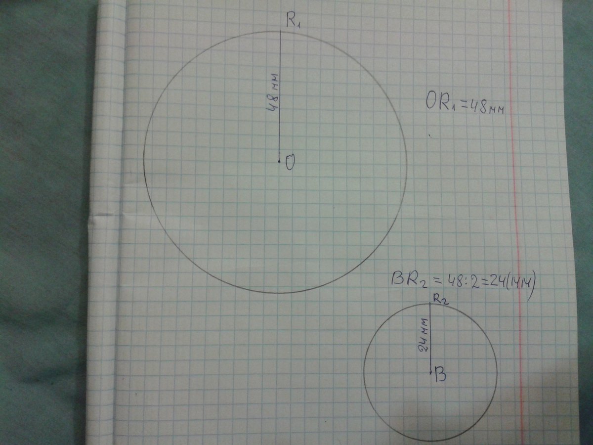 Длина радиуса окружности с центром О равна 48 мм.Радиус окружности с центром В вдвое меньше.Выполни чертёж.