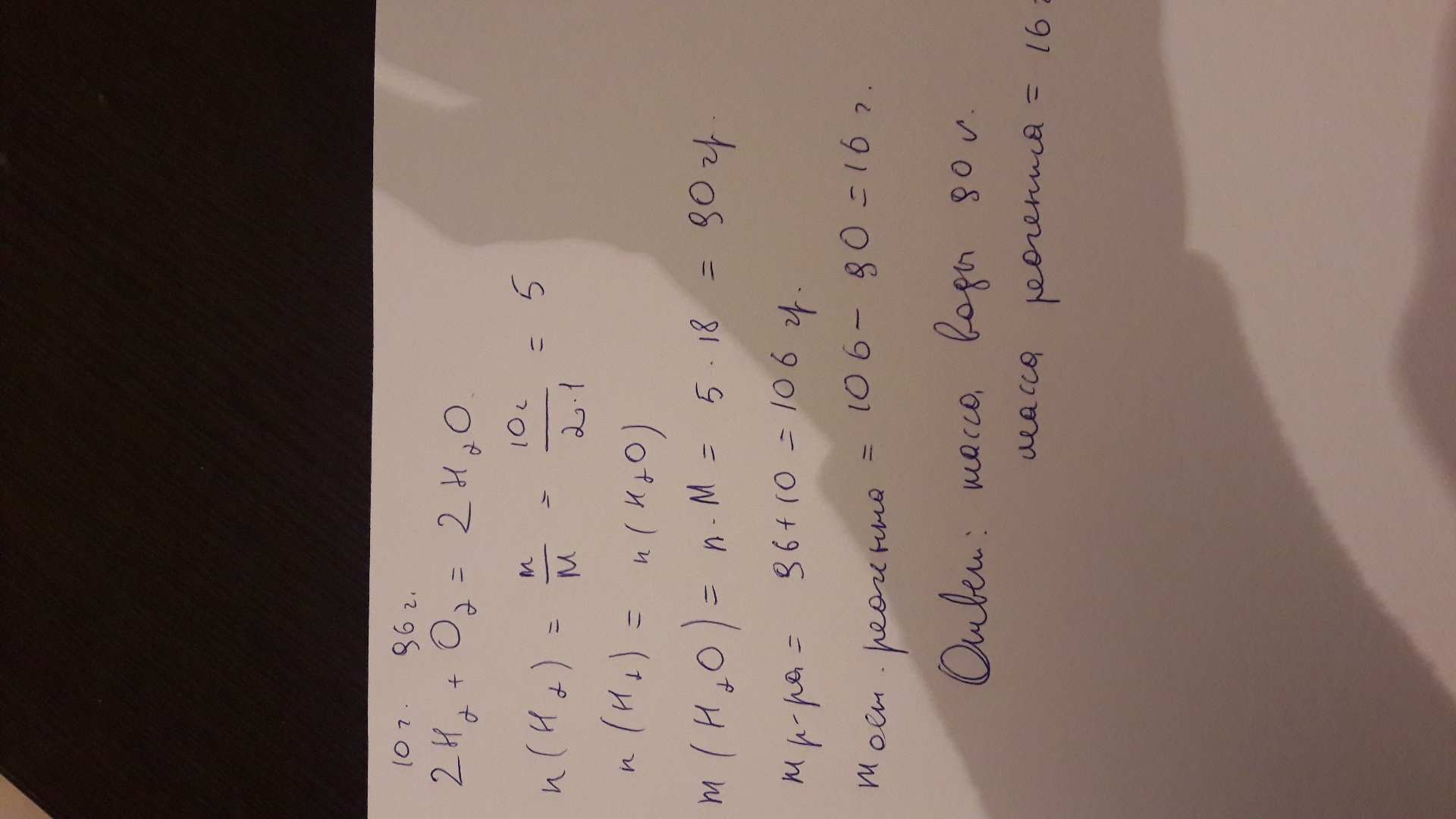 смесь 10 г водорода и 96 г кислорода взорвали.Вычислите массу образовавшейся воды и массу реагента,оставшегося после реакции.Пожалуйста, поподробнее!!!