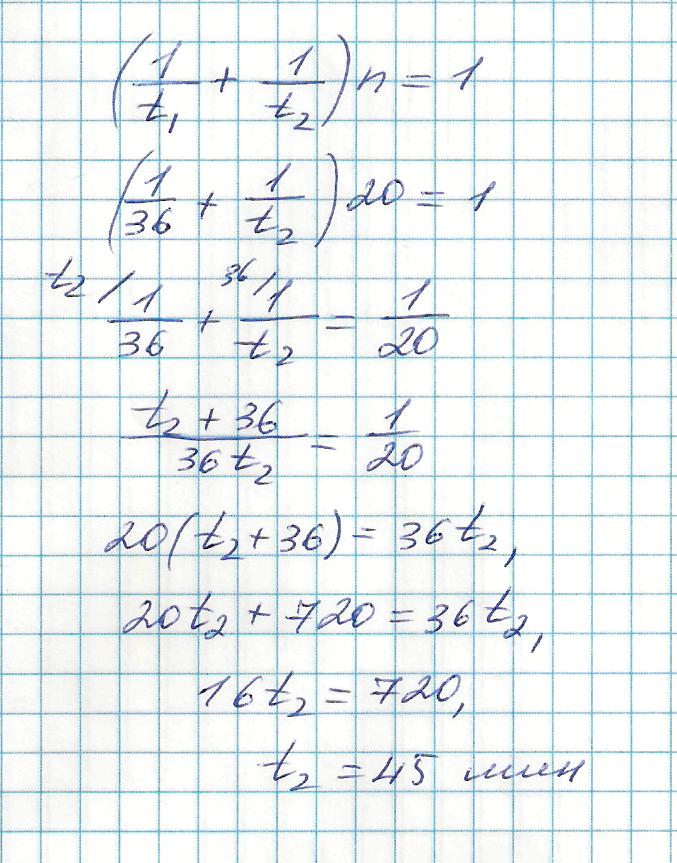 Для решение задач на совместную работу существует формула (1 / t1 + 1 / t2)n=1, где 1 - вся работа, t1 - время первой трубы, t2 - время второй трубы, n - совместное время двух труб. Отсюда получаем (1/36 + 1/t2)20=1. Находим t2. Получается 45. Если есть вопросы, то задавайте.