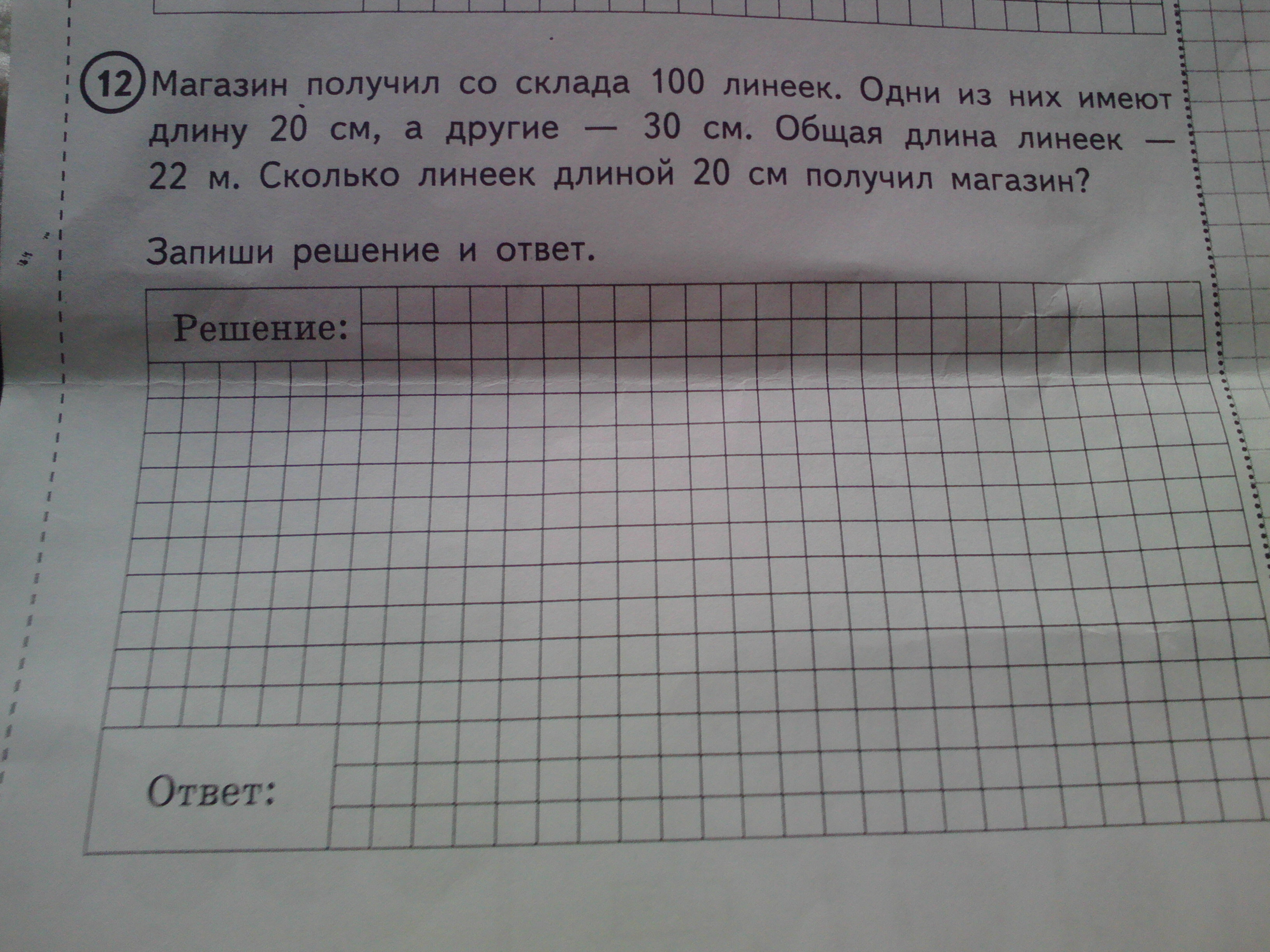 Магазин получил со склада 100 линеек.Одни из них имеют длину 20 см,а другие-30 см.Общая длина 22 м.Сколько линеек длиной 20 см получил магазин?