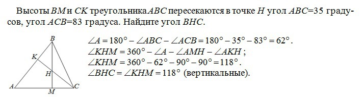 Высоты BM и CK треугольника abc пересекаются в точке H угол ABC=35 градусов, угол ACB=83 градуса. Найдите угол BHC.