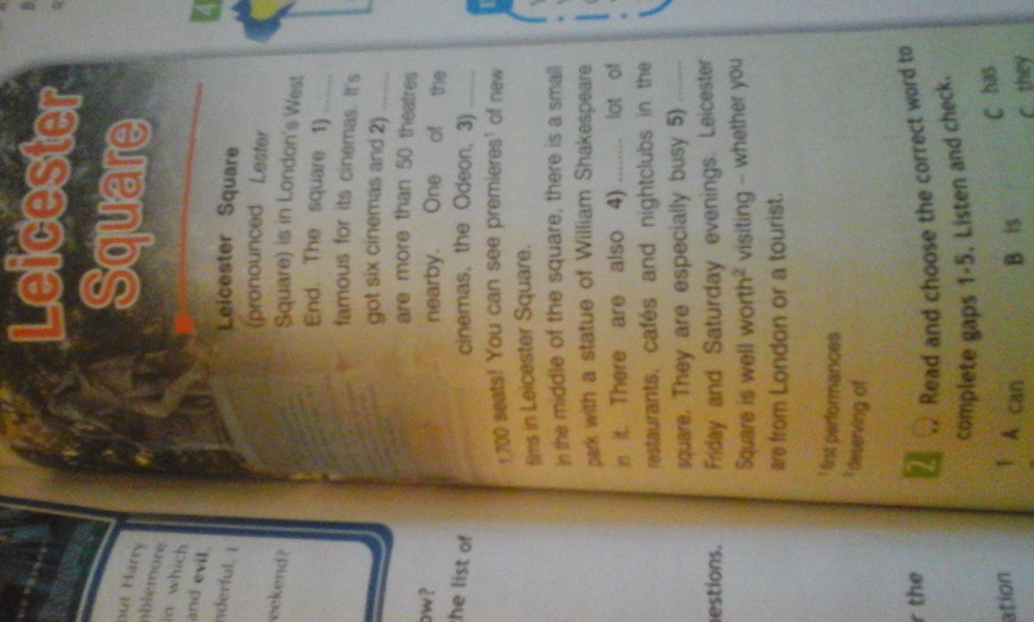 Лестер сквер (произносится как Лестер Сквер) находится в лондонском Вест Энде Площадь славится своими кинотеатрами У неё шесть кинотеатров и более 50 театров в одном из кинотеатров Одеон 1700 мест! Вы можете увидеть премьеры новых фильмов в лестер- Сквер В центре Площади есть не большой парк со статуей Уильяма Шекспира Есть также много ресторанов, кафе и ночных клубов на площади они в основном заняты в пятницу и в субботу вечером Лестер сквер стоит посетить являетесь ли вы жителями Лондона или туристами.