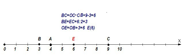 на координатной луче отметьте точки 0 (0), А (4), В (3), с (9).какую координату имеет точка Е середине отрезка вс