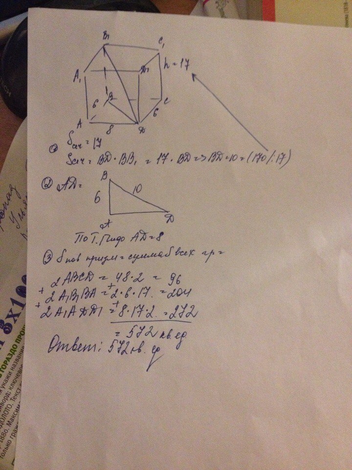 В основании призмы лежит прямоугольник, одна из сторон которого равна 6. Площадь диагонального сечения равно 170 см.кв. Найдите площадь поверхности призмы и не объём, если не высота равна 17см.