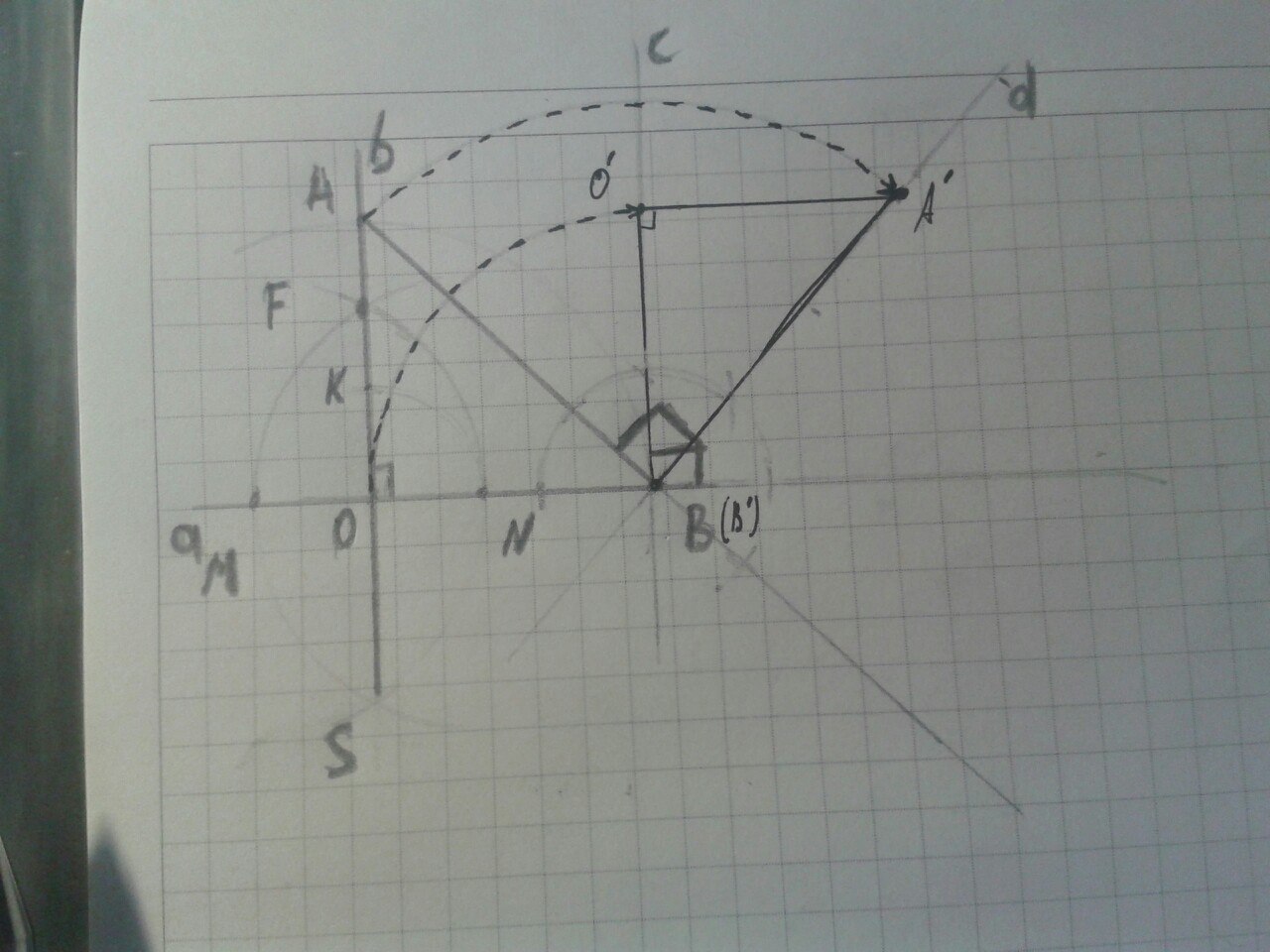 2) Раствором циркуля берём расстояние BO и переносим его на прямую c,откладывая от точки B;отмечаем точку O'. Затем берём расстояние AB и откладываем на прямой d от точки B его же,отметив точку A'. AB=A'B,OB=O'B. Соединим точки: B с O',O' с A',A' с B