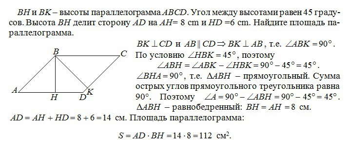 BH и BK - высоты параллелограмма ABCD. Угол между высотами равен 45градусов. Высота BH делит сторону AD на AH= 8 cm и HD =6 cm. Найдите площадь параллелограмма.