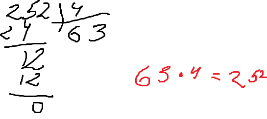 Вот тебе решение 252 делить на 4 письменно, с проверкой, ссори что так корявенько вышло, но вроде все понятно.....................удачи)
