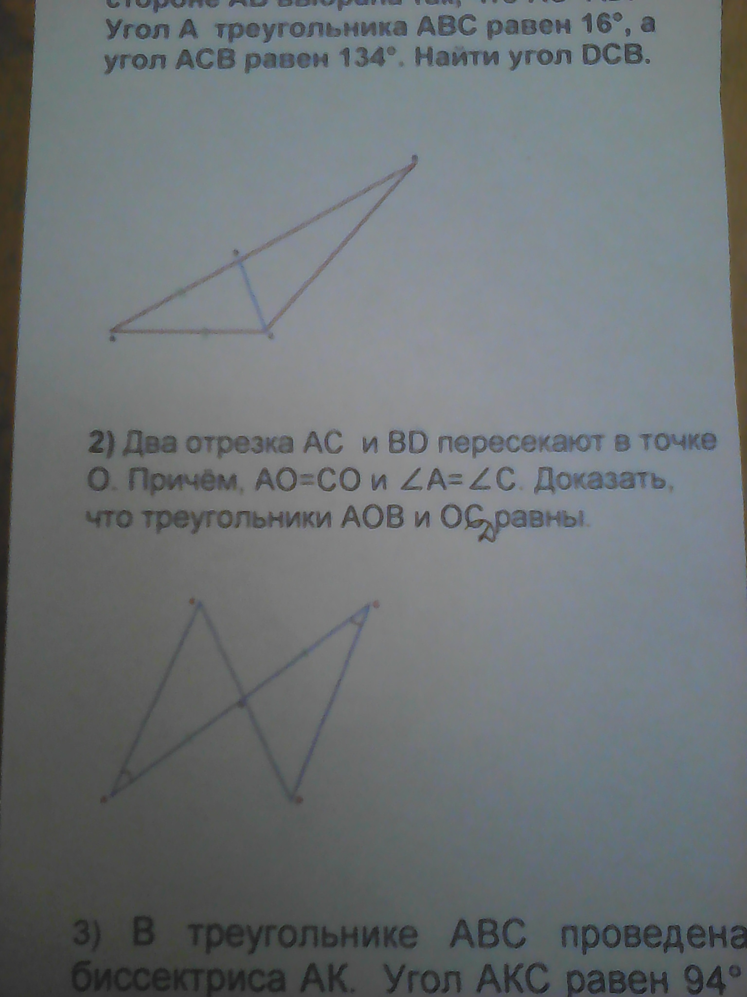 Т.к сторона AO=OC, угол С = углу А угол DOC=AOB они вертекальные. И по 2 признаку рав-ва треугольника это тр-ки равны. Сторона и прилежащие к ней два угла.