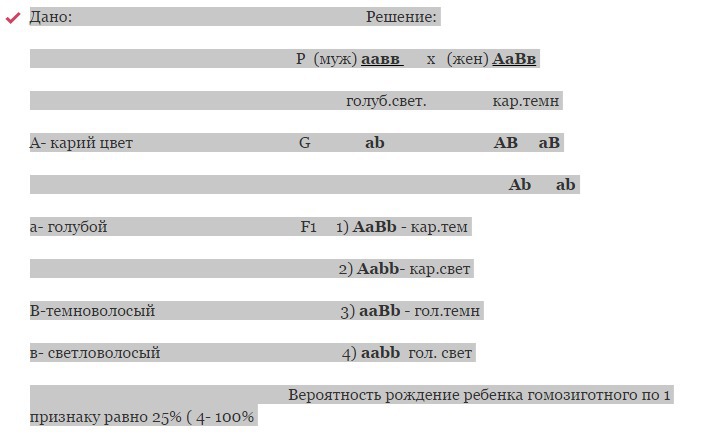 В брак вступили кареглазый светловолосый мужчина, гетерозиготный по 1 признаку и голубоглазая темноволосая женщина, гетерозиготная по 2 признаку. Определите генотипы супружеской пары, а также генотипы и фенотипы детей. Установите вероятность рождения детей с генотипом гомозиготным по одному признаку.
