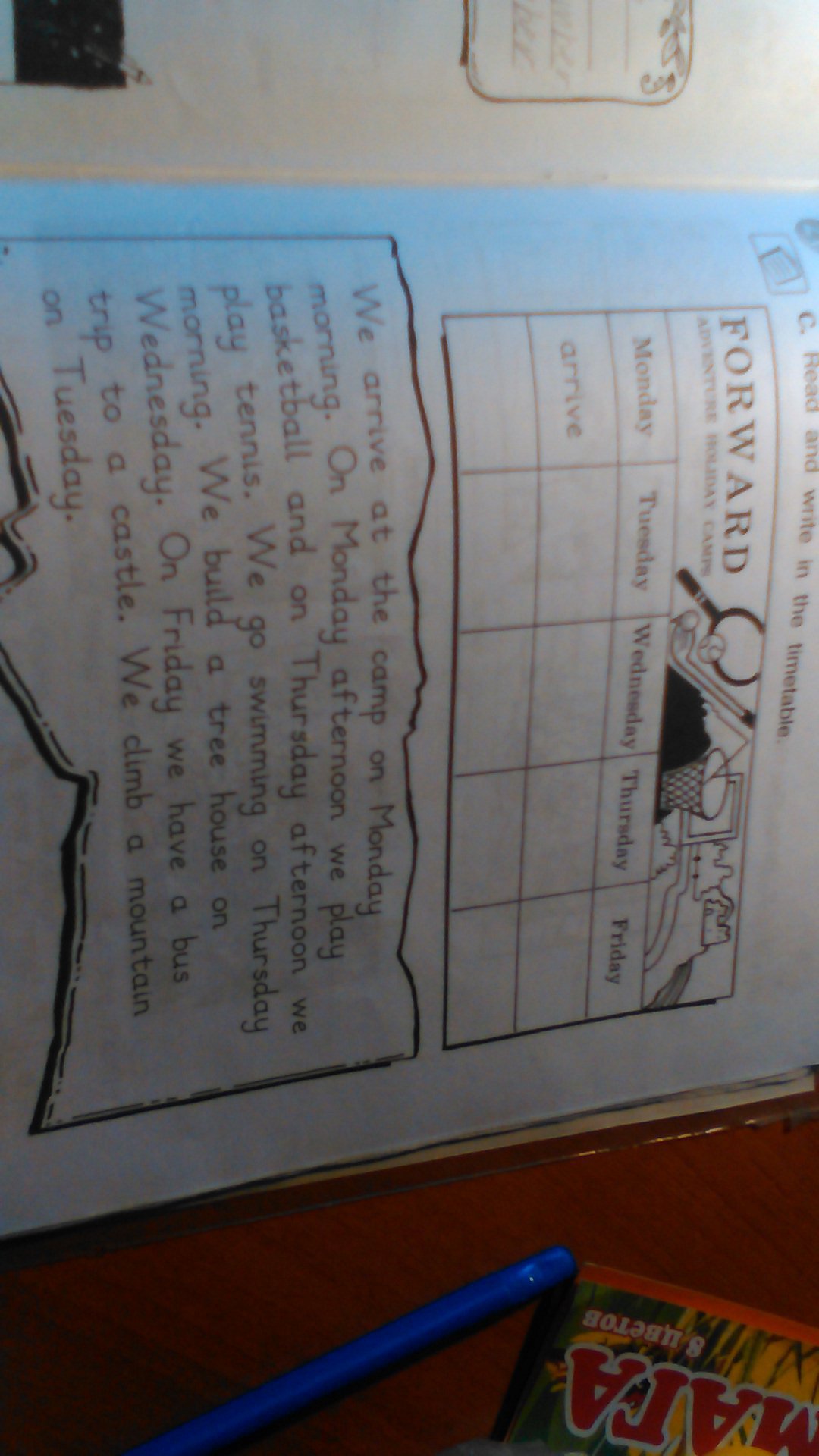 Мы приезжаем в лагерь в понедельник утром. В понедельник днем мы играем в баскетбол, а в четверг днем мы играем в теннис.Мы идём плавать в четверг утром. Мы строим домик на дереве в среду. В пятницу мы имеем автобус на поезду в замок. Мы поднимаемся в горы во вторник.
