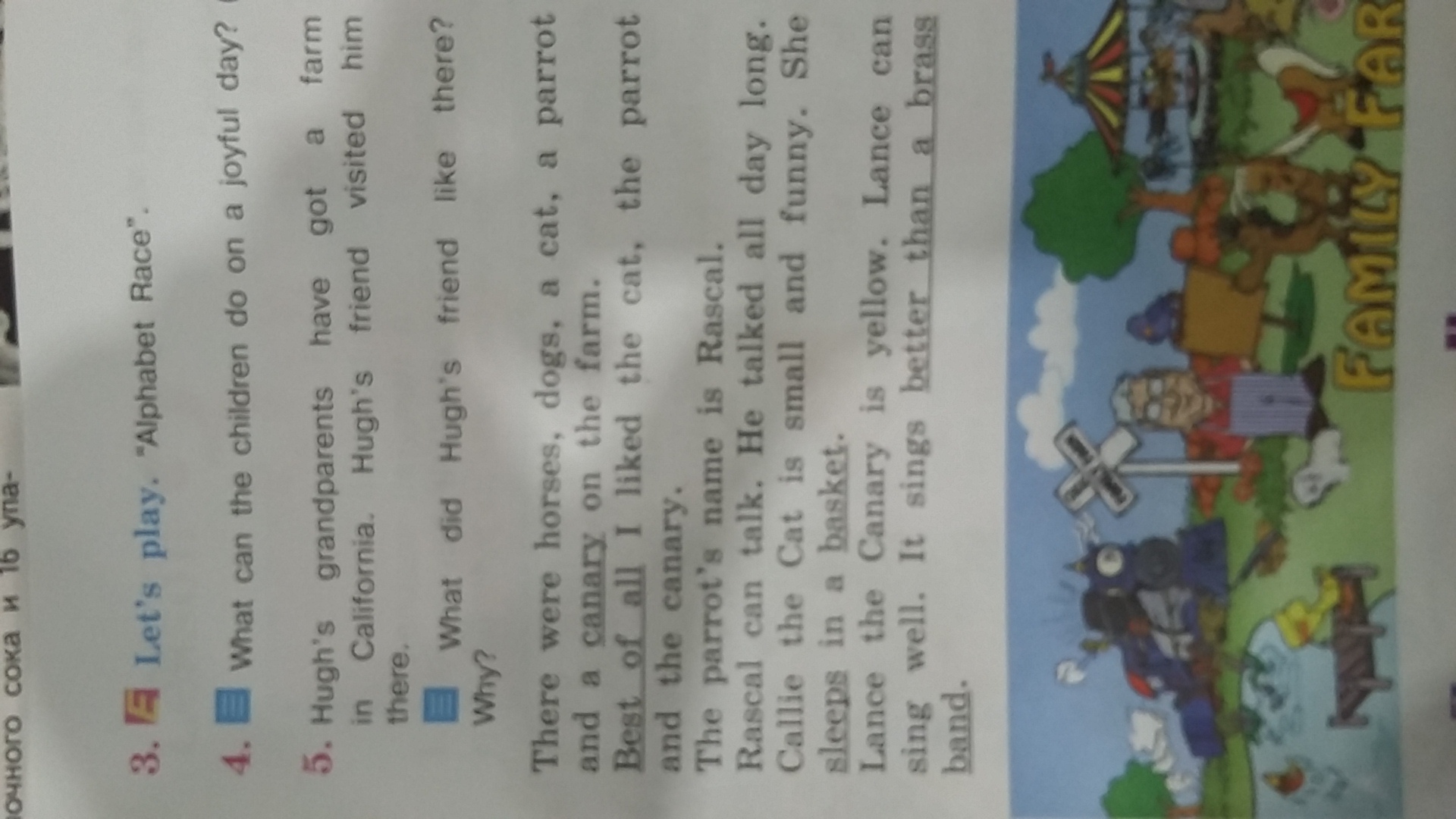 3. Давайте играть алфавит гонки ". То, что дети могут делать на радостный день? Бабушки и дедушки Хью получили ферму в Калифорнии. Друг Хью побывал там, что сделал Хью, как там? Там были horien, собаки, кошки, попугай и канарейка на ферме. Лучше всего понравился кот, попугай и канарейку. имя попугай является Rascal. Мошенник может говорить. Он говорил день. Калли Кошка маленькая и смешная. Она спит в корзине. Копье в Канарские желтый. Лэнс может петь Он поет лучше, чем духовой оркестр.