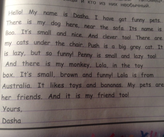 Перевод: Привет! Я хочу рассказать тебе о девочке Даша.У нее есть забавные питомцы.Маленький и красивый пес Боо,который рядом с диваном и кошки.Пуш-это большой серый кот.Пенни-это маленький и ленивый кот.Также у нее есть обезьянка Лола.Она любит бананы и игрушки.Все питомцы ее друзья!