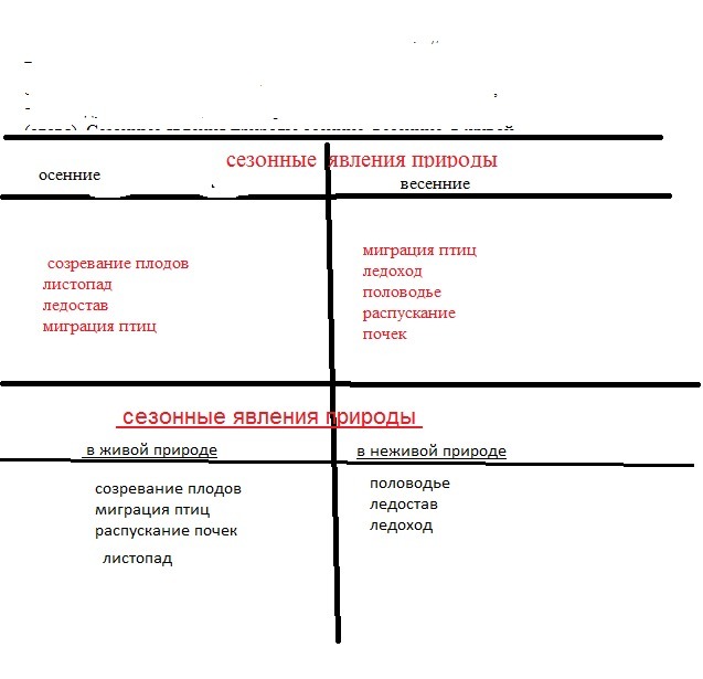 Раздели сезонные явления природы на две группы двумя разными способами. Запиши в таблицу. Созревание плодов, половодье, листопад, ледостав, ледоход, миграция птиц, распускание почек (слова). Сезонные явления природы осенние, весенние, в живой природе, в неживой природе.