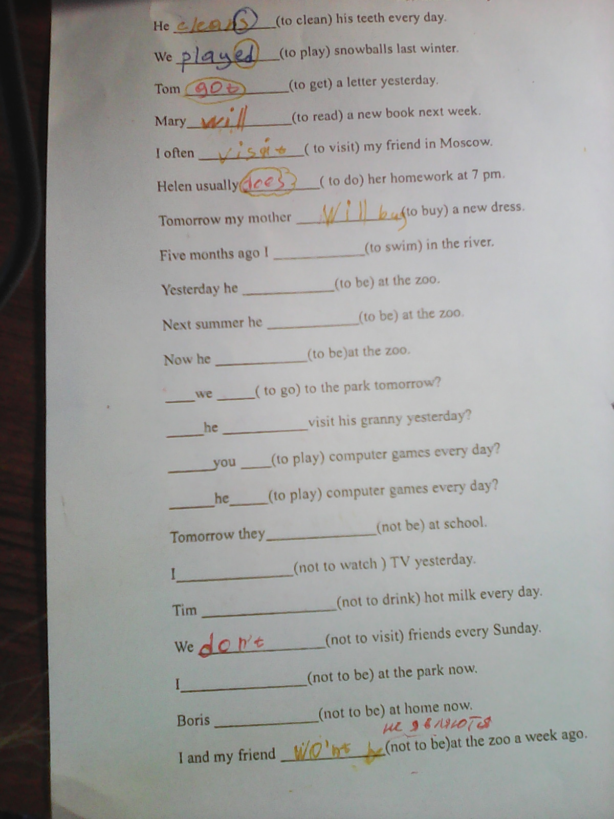 I swam ,he was, he wii be ,he is ,Will we go...?Did he visit ...? Do you play...?Does he play ...?they won"t be , Tom doesn"t drink ,We don"t visit ?I am not , Boris isn"t , Me friend and I were not ..