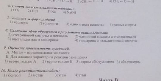 в 6ом что-то не так. спирт НЕ может взаимодействовать только с HCl и то под вопросом, с NaOH идёт, но сильно смещается в сторону исходных веществ, с натрием идёт и в кислороде, как и любую органику можно сжечь. 1) 3) наверное