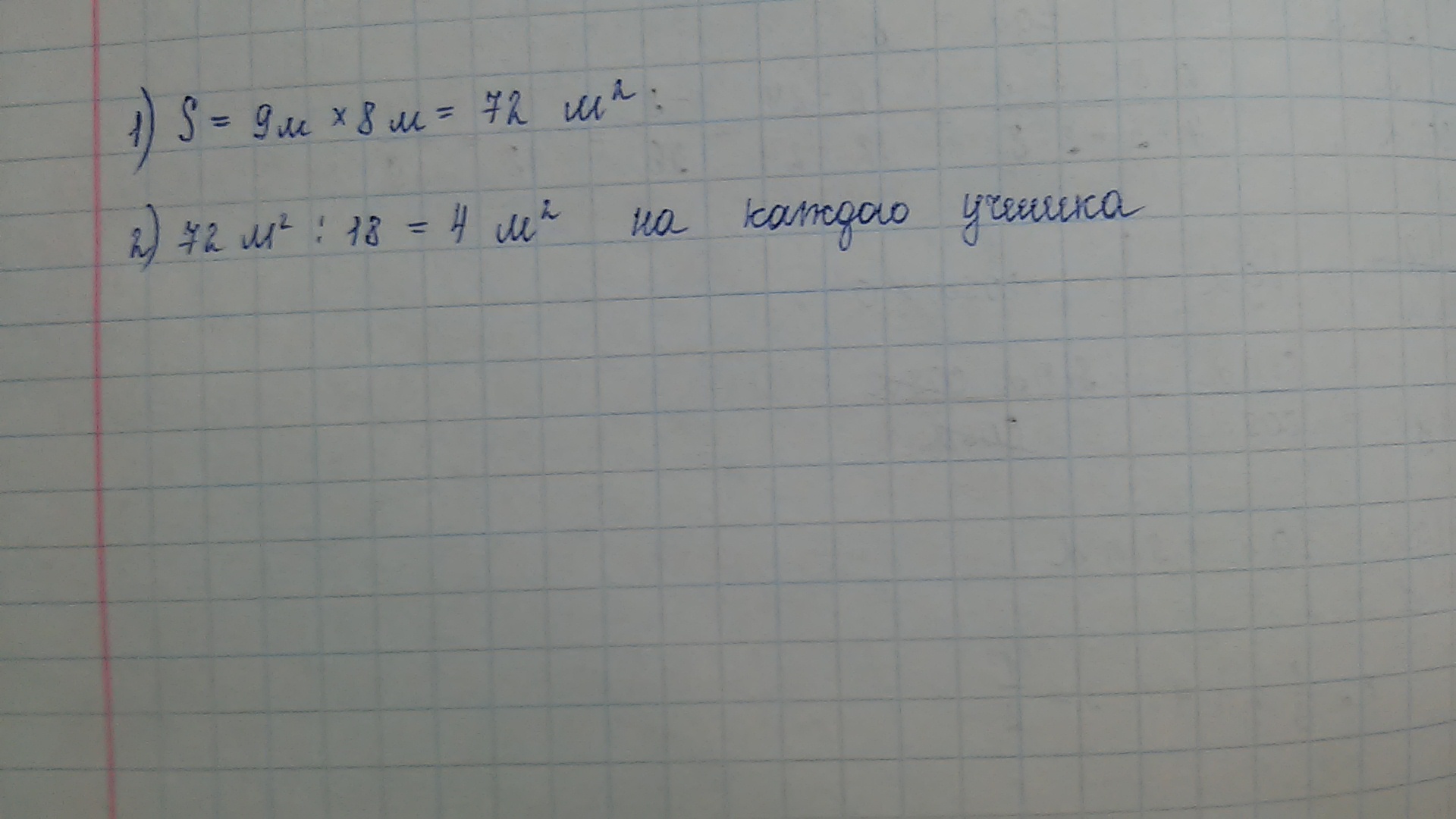 длина помещения 9 м а ширина 8 м в классе 18 участников сколько квадратных метров приходится на каждого ученика помогите пожалуйста