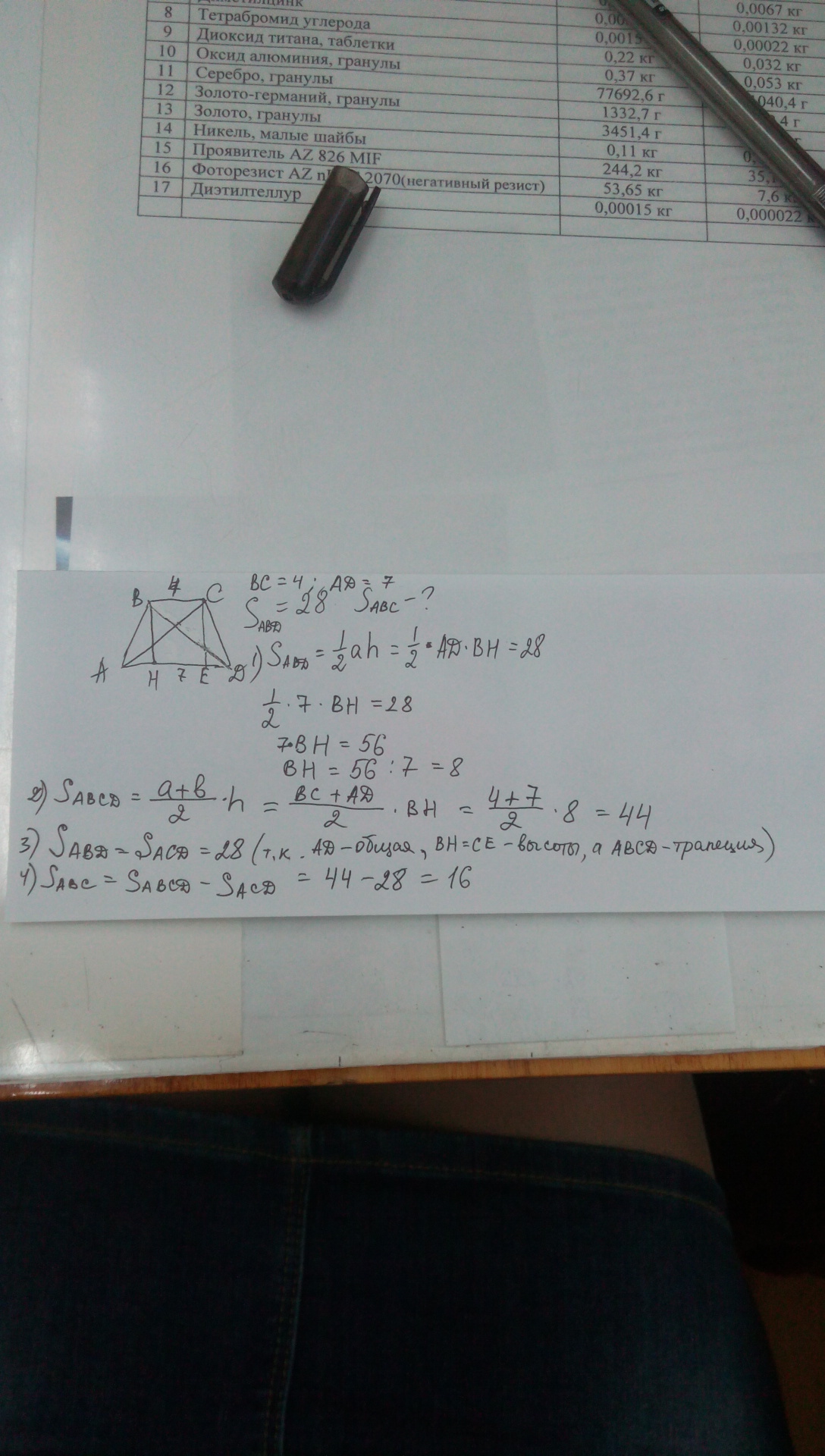 В трапеции ABCD с основаниями AD=7, BC=4, площадь треугольника ABD равна 28. Найдите площадь треугольника ABC.
