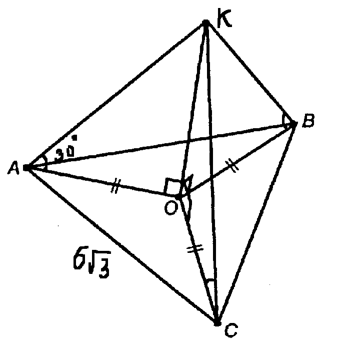 найти расстояние от точки к до плоскости правильного треугольника abc если прямые проходящие через точку к и вершины этого треугольника образуют с плоскостью равные углы в 30 гадусов а сторона данного основания треугольника 6 корень из 3. помогите пожалуйста решить задачку.