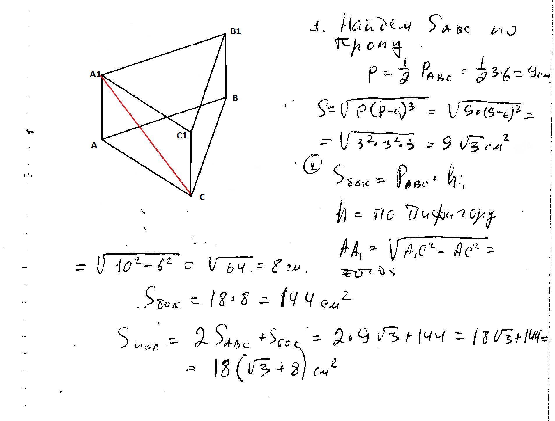 Сторона основания правильной треугольной призмы равна 6 см, а диагональ боковой грани 10 см. Найдите площадь боковой и полной поверхности призмы