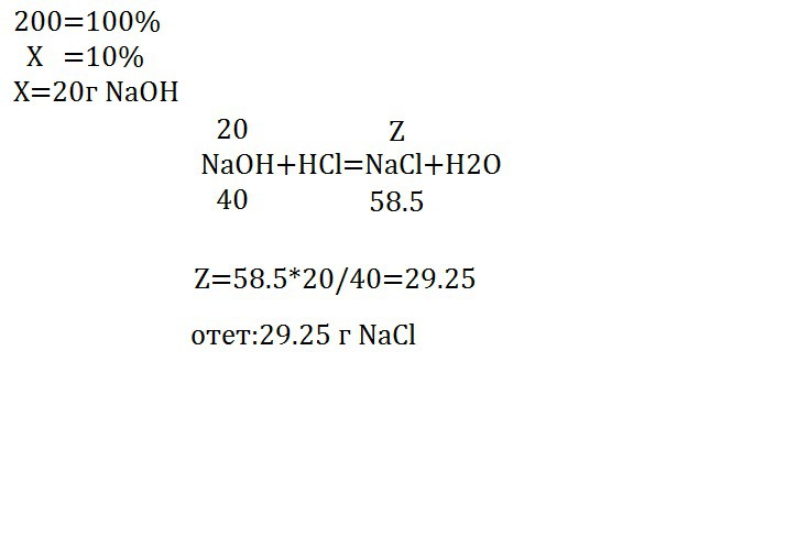 вычислите масу хлорида натрия, полученного в реакции нейтрализации 200 г 10%раствора гидроксид натрия с соляной кислотой.