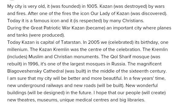 Сейчас Казань - столица Татарстана. В 2005 мы празднуем его тысячелетие со дня основания. Казанский Кремль был центром праздника. Кремль включает в себя мусульманские и христианские памятники. Мечеть Квола Шарифа была восстановлена в 1996, это одна из самых больших мечетей России. Великолепный Благовещенский собор был построен в середине 16 века. Я уверен, мой город будет еще лучше и прекраснее. Скоро будут построены новые станции метро и новые дороги. Новые потрясающие здания будут разработаны в будущем. Я надеюсь, что наши люди построят новые театры, музеи, уникальные медицинские клиники и большие библиотеки.