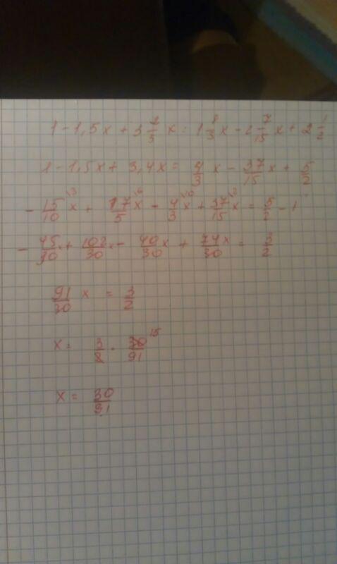Я решила 1-1,5x+3 2/5x=1 1/3x-2 7/15x+2 1/2надеюсь правильно)